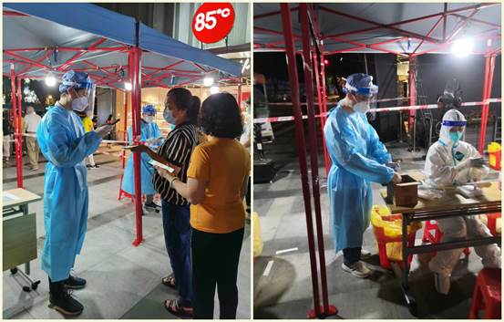 由于陳炯龍、陳英東兩位此前都有過負(fù)責(zé)核酸檢測掃碼工作的經(jīng)驗(yàn),在志愿服務(wù)崗前培訓(xùn)會議上,他們主動(dòng)提出要承接這項(xiàng)亟需專注力和耐心的工作。陳炯龍為老人家仔細(xì)核對姓名、身份證號,耐心解釋工作流程,獲得老人一致好評。當(dāng)醫(yī)護(hù)組上缺少志愿者時(shí),陳英東又化身為核酸檢測樣管“護(hù)送人”,認(rèn)真核對核酸樣管數(shù)量及檢測人數(shù),及時(shí)準(zhǔn)確地報(bào)送給醫(yī)護(hù)組……他們像陀螺一樣從晚上8點(diǎn)開始連軸轉(zhuǎn)忙碌到半夜12點(diǎn)多才結(jié)束任務(wù)回家。